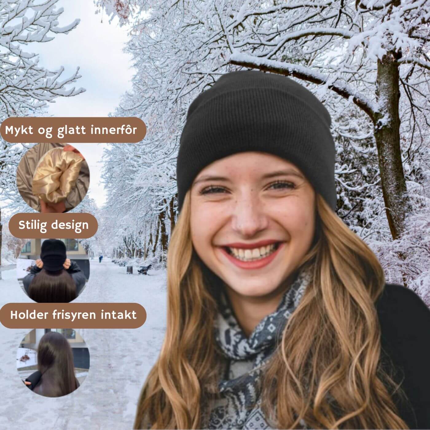 Kalde dager skal ikke ødelegge en god hårdag. Denne luen er laget for å hjelpe mot frizz, statisk hår og det urolige, slitne utseendet vinteren ofte gir. Den holder deg varm samtidig som den gir håret ditt skånsom pleie gjennom hele sesongen.